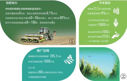 截至目前,梨树县建立了100个梨树模式示范推广核心基地,全县205.2万亩耕地采用了保护性耕作。2020年,13.3万公顷示范田比常规地块增产8%以上,每公顷节本增收2920元左右。