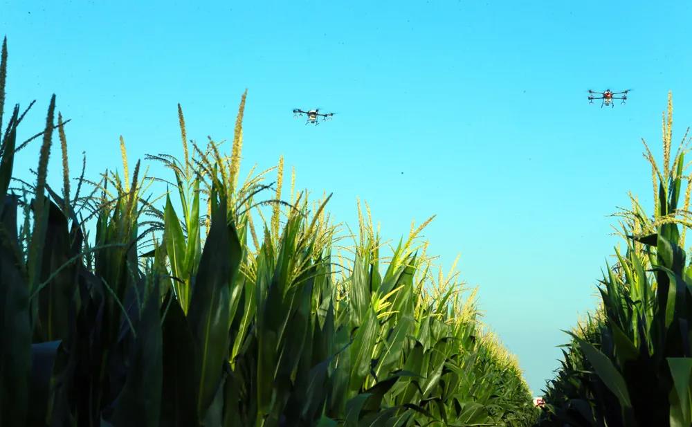 无人机在梨树县玉米田上空开展植保作业,一天能完成40多公顷。丁 研摄